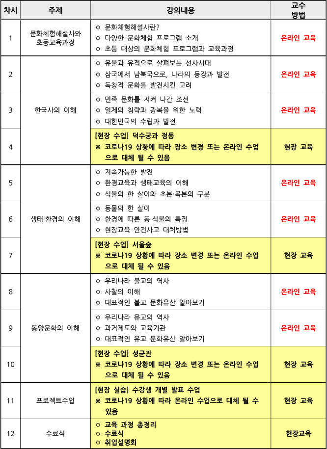 스쿨김영사에서는 체험학습 전문 해설사를 양성하기 위한 교육과정을 아래와 같이 개설합니다. 이번 교육과정은 비대면 온라인 교육과 대면 현장 교육이 복합적으로 구성되었으며, 한겨레문화센터와 공동으로 기획 운영합니다. 기초과정 수료 후 소정의 절차와 심사를 걸쳐 스쿨김영사 문화체험해설사로 활동하게 됩니다.