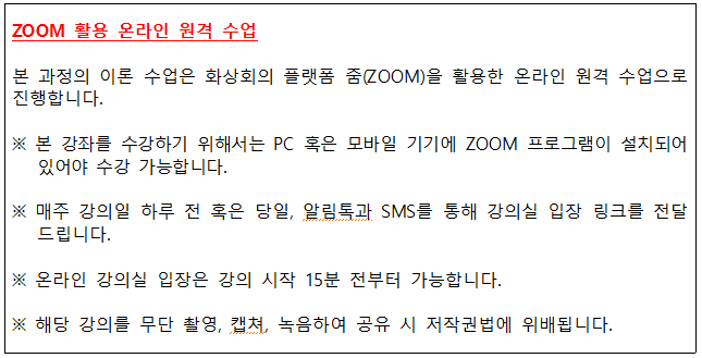 ○ 수강시간 : 목 10:00~13:00 (12회/총36시간)