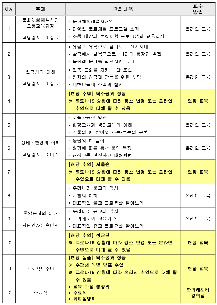 스쿨김영사에서는 체험학습 전문 해설사를 양성하기 위한 교육과정을 아래와 같이 개설합니다. 이번 교육과정은 비대면 온라인 교육과 대면 현장 교육이 복합적으로 구성되었으며, 한겨레문화센터와 공동으로 기획 운영합니다. 기초과정 수료 후 소정의 절차와 심사를 걸쳐 스쿨김영사 문화체험해설사로 활동하게 됩니다.