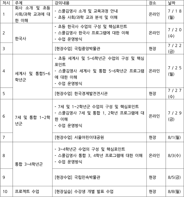 7. 강사 직무 소양 교육 안내(합격자에 한해 실시함) 1) 일시 : 2022년 7월 18일~8월 8일까지(총 10회) 2) 시간 : 월/수/금 10:00~13:00 3) 정원 : 20명 4) 교육료 : 전액 무료 5) 참고사항 - 출석 80%미만자 탈락(지각, 조퇴 3회는 결석 1회로 처리) - 본 교육 수료자에 한해 자격시험 응시 가능(발급비 별도 5만원) * <교과체험학습지도사> 2급 민간자격증 6) 교육과정(커리큘럼)