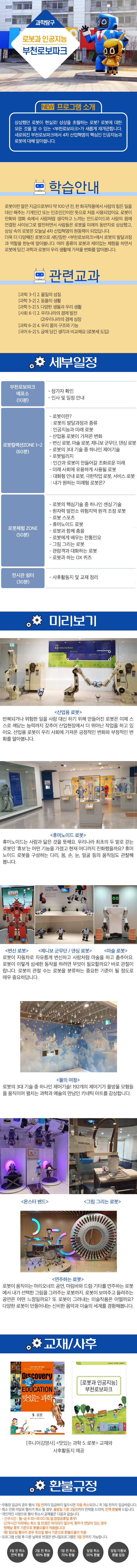 ㆍ시간 : 오전 10:00~12:30, 오후 14:30~17:00 (날짜 별로 상이) ㆍ만나는 장소 : 부천로보파크 로비 ㆍ회비 : 1회당 32,000원