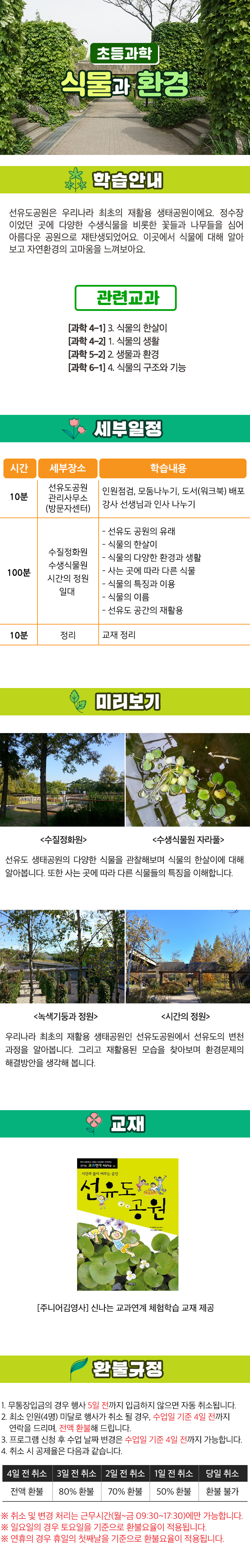 ㆍ시간 : 오전 10:00~12:00, 오후 14:30~16:30 (날짜별로 상이) ㆍ만나는 장소 : 선유도공원관리사무소(방문자센터) 앞 ㆍ회비 : 1회당 38,000원