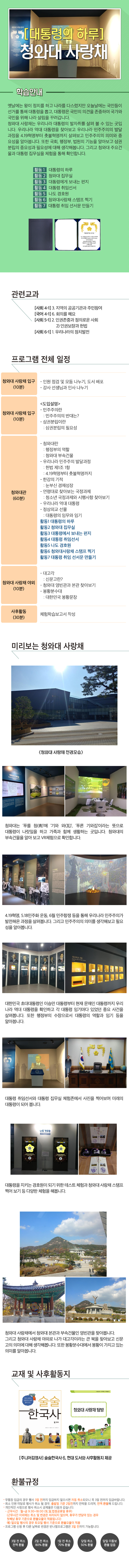 ㆍ시간 : 오전 10:00~12:00, 오후 14:30~16:30 (날짜 별로 상이) ㆍ만나는 장소 : 청와대 사랑채 입구 ㆍ회비 : 1회당 28,000원