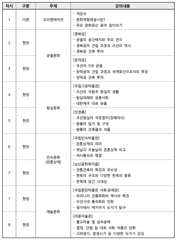 문화체험해설사 전문 강사 실전 활동 프로그램! 문화체험해설사란?역사 ․ 문화 ․ 민속 분야의 전문지식을 가지고 있고, 박물관 ․ 궁궐 ․ 유적지 등에서 일반인을 대상으로 관련 분야의 내용을 쉽고 재미있게 이야기할 수 있는 전문가를 말합니다. 문화체험해설사 심화과정이란?문화유산에 대한 관심과 애정이 많고 문화유산에 담긴 역사적 배경이나 특징에 대해 자세히 배우고자 하는 성인들을 대상으로, 문화유산 현장에서 직접적으로 이루어지는 현장 실무교육 과정입니다. 추천 수강 대상- 현재 문화체험해설사로 활동하는 분- 해설사 활동에 관심있는 분 - 문화유적에 담긴 이야기를 배우고자 하는 분- 우리 역사와 문화에 관심 있는 모든 분들을 대상으로 합니다.과정의 특장점- 문화유적 현장 답사가 중점이 되는 실전 중심 교육- 분야별 전문지식을 축척할 수 있는 심화 교육- 해설사 활동에 꼭 필요한 강의기법 노하우 전달○ 강좌명 : 한겨레문화센터 문화체험해설사 심화과정○ 교육기간 : 2019/07/11 ~ 2019/09/05○ 수강시간 : 목 10:00~13:00 (8회/총24시간)○ 수강정원 : 20명○ 수강료 : 200,000원 (장소 별 입장료 별도)