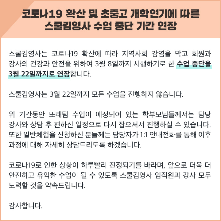 제목 코로나19 확산 및 초중고 개학연기에 따른 스쿨김영사 수업 중단 기간 연장