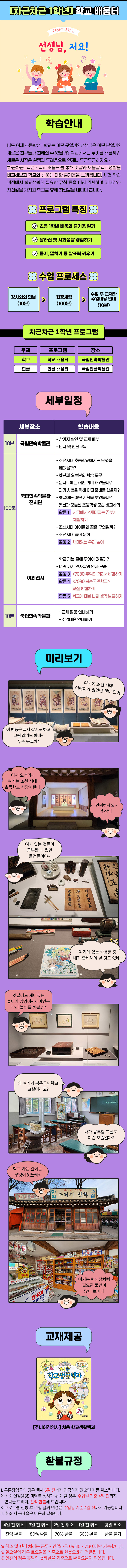 ※ 회비포함내역 : 강사비, 교재, 입장료 모두 포함 ㆍ인원 : 6명 당 강사 1명 ㆍ강사 : 스쿨김영사 전임강사 외 다수 ㆍ대상 : 초등 1학년 ㆍ준비물 : 필기도구 ㆍ신청자가 4명 미만일 경우, 행사가 취소될 수 있습니다 ㆍ무통장 입금의 경우 3일 전까지 입금바라며, 행사 취소시 전액환불 됩니다.