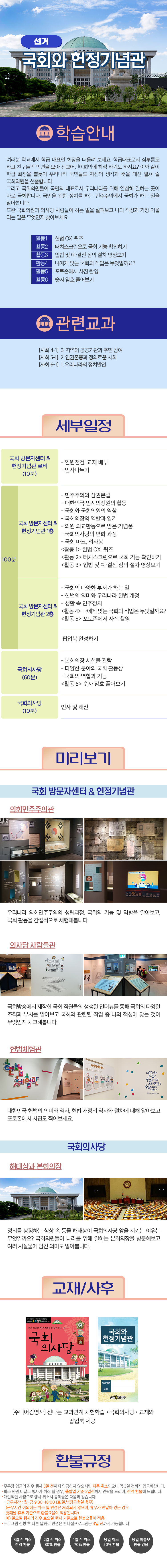 ㆍ시간 : 오전 10:00~13:00, 오후 14:30~17:30 (날짜 별로 상이) ㆍ만나는 장소 : 국회 방문자센터(헌정기념관) 1층 로비 ㆍ회비 : 1회당 30,000원