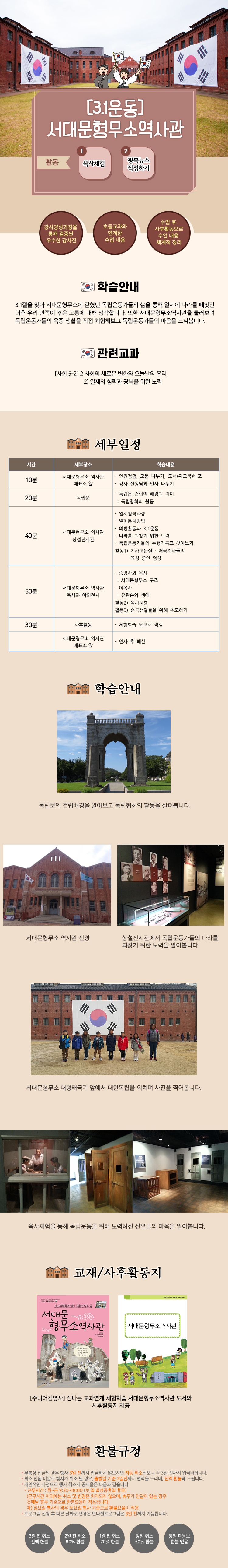 ㆍ시간 : 오전 09:30~12:00, 오후 14:30~17:00 (날짜 별로 상이) ㆍ만나는 장소 : 서대문형무소역사관 매표소 앞 ㆍ회비 : 1회당 28,000원