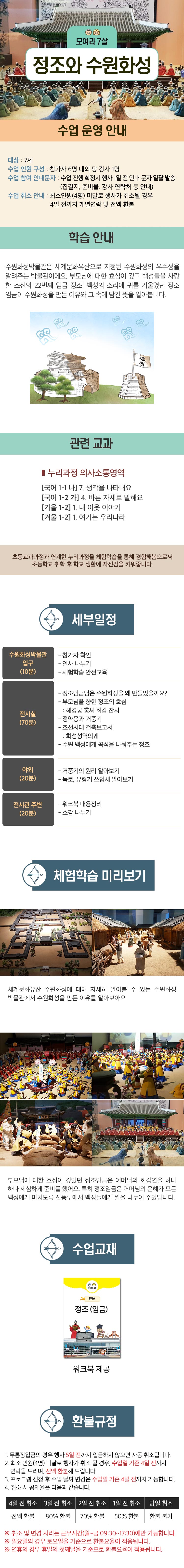 ㆍ시간 : 오전 10:00~12:00, 오후 14:30~16:30 (날짜별로 상이) ㆍ만나는 장소 : 수원화성박물관 입구 ㆍ회비 : 1인당 38,000원
