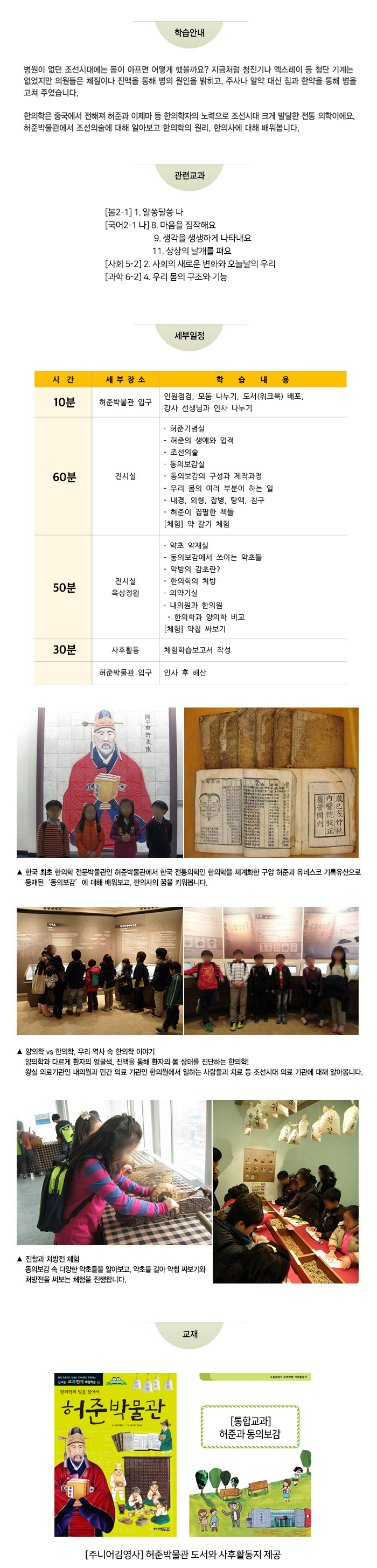 ㆍ시간 : 오전 10:00~12:30, 오후 14:30~17:00 (날짜 별로 상이) ㆍ만나는 장소 : 허준박물관 입구 ㆍ회비 : 1회당 28,000원