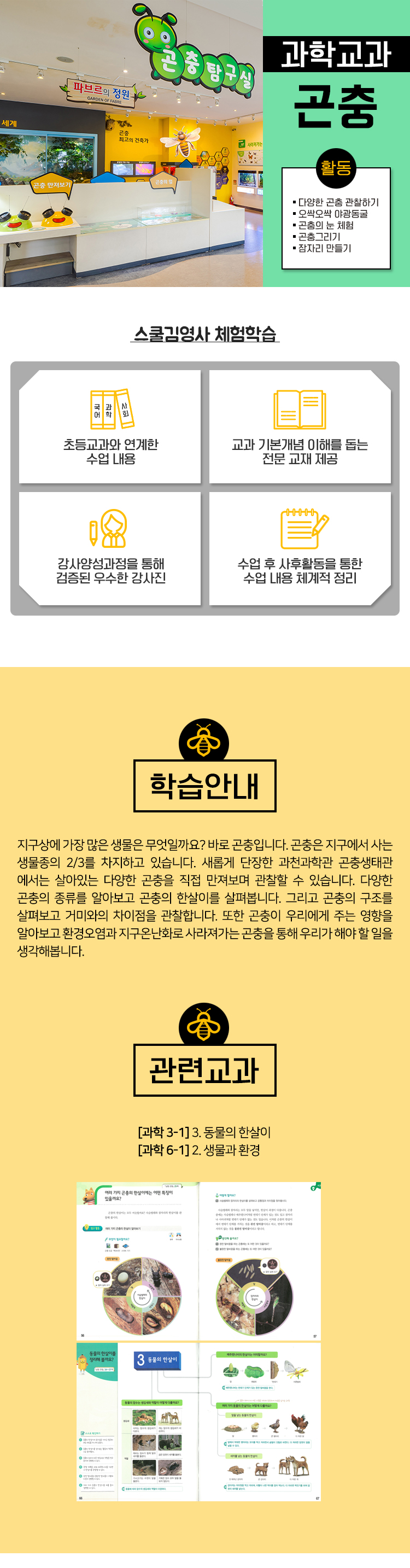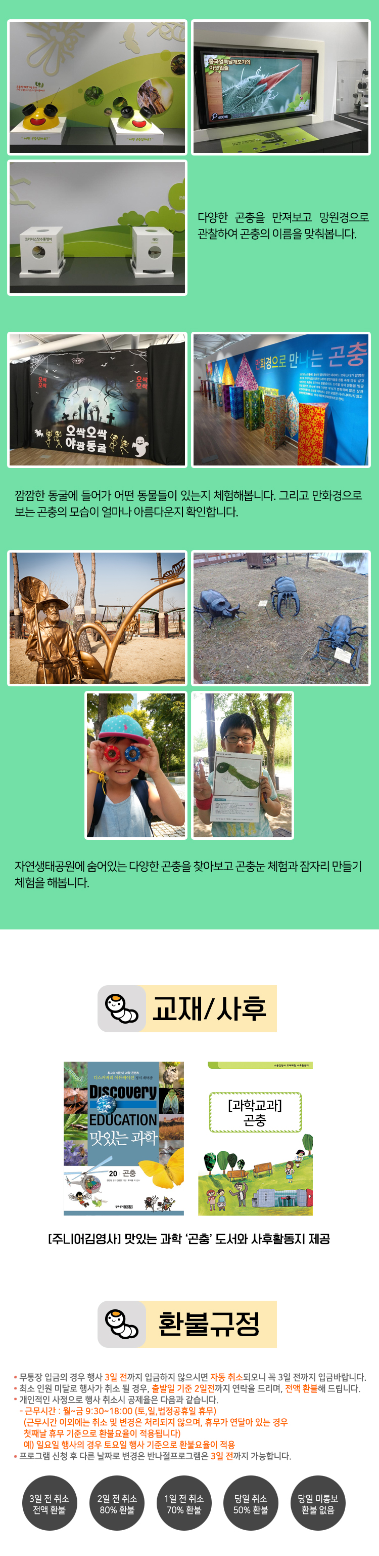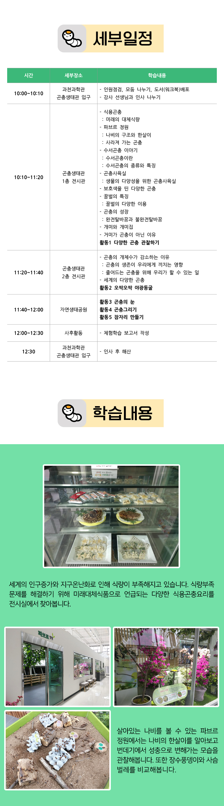 ㆍ시간 : 오전 10:00~12:30 ㆍ만나는 장소 : 과천과학관 곤충생태관 앞 ㆍ회비 : 1회당 28,000원